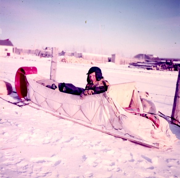 Jeune garçon assis dans un grand traîneau sur la neige. Photo : Rosemary Gilliat Eaton (e010980928)