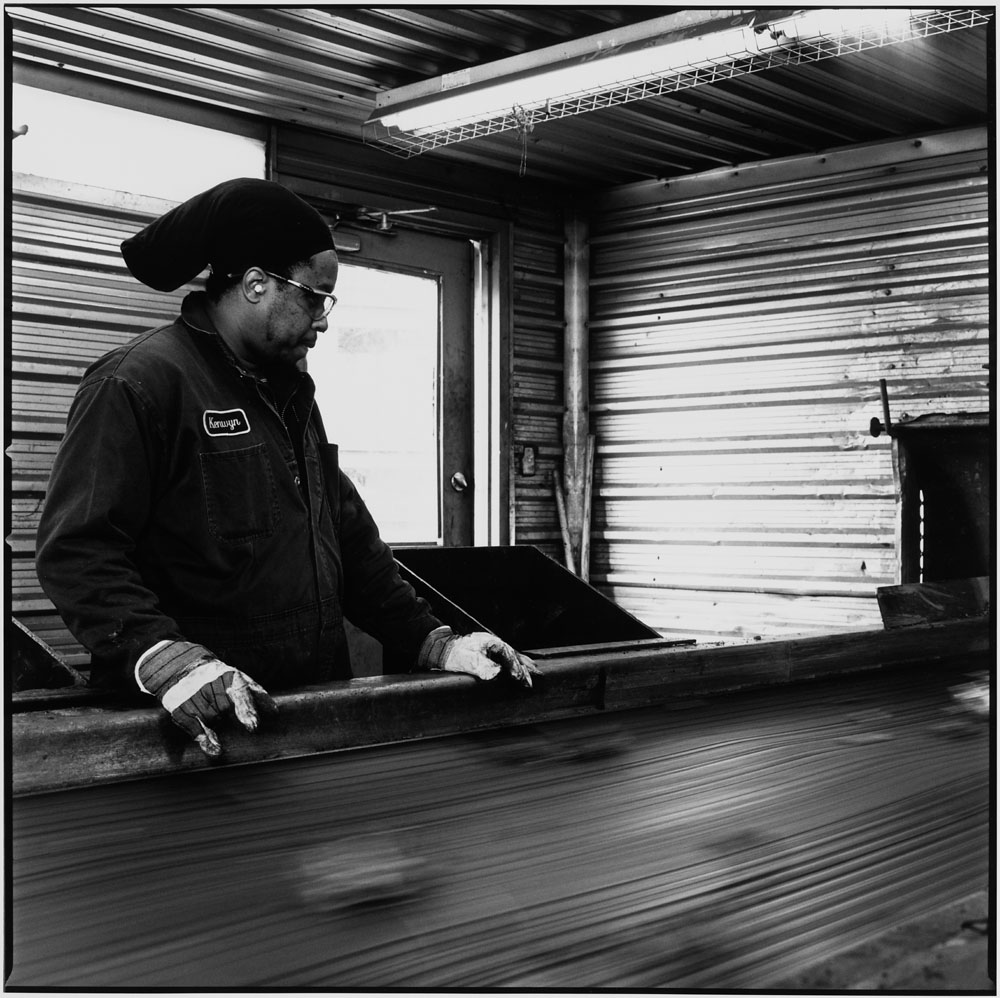 Kenwyn et moi-même avons discuté de ce qui devait ou non être photographié. Pour lui, travailler se résumait à attendre continuellement que des morceaux de cuivre passent parmi la ferraille sur le convoyeur. Cela était essentiellement la raison d’être de son métier. Ensuite, il y avait le vestiaire – l’endroit où commençait et se terminait chaque quart de travail. Il s’agissait d’ailleurs du seul endroit où il était possible de photographier Kenwyn. Par contre, afin d’obtenir un peu d’intimité, nous devions attendre que tous ses collègues quittent l’endroit après leur quart de travail.