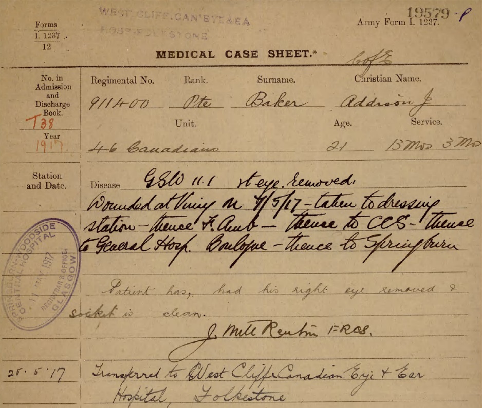 Exemple de fiche médicale provenant de la collection de BAC : celle du soldat Addison Baker.