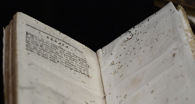 Dommages causés par des lépismes qui ont grignoté le livre (Wikipedia)