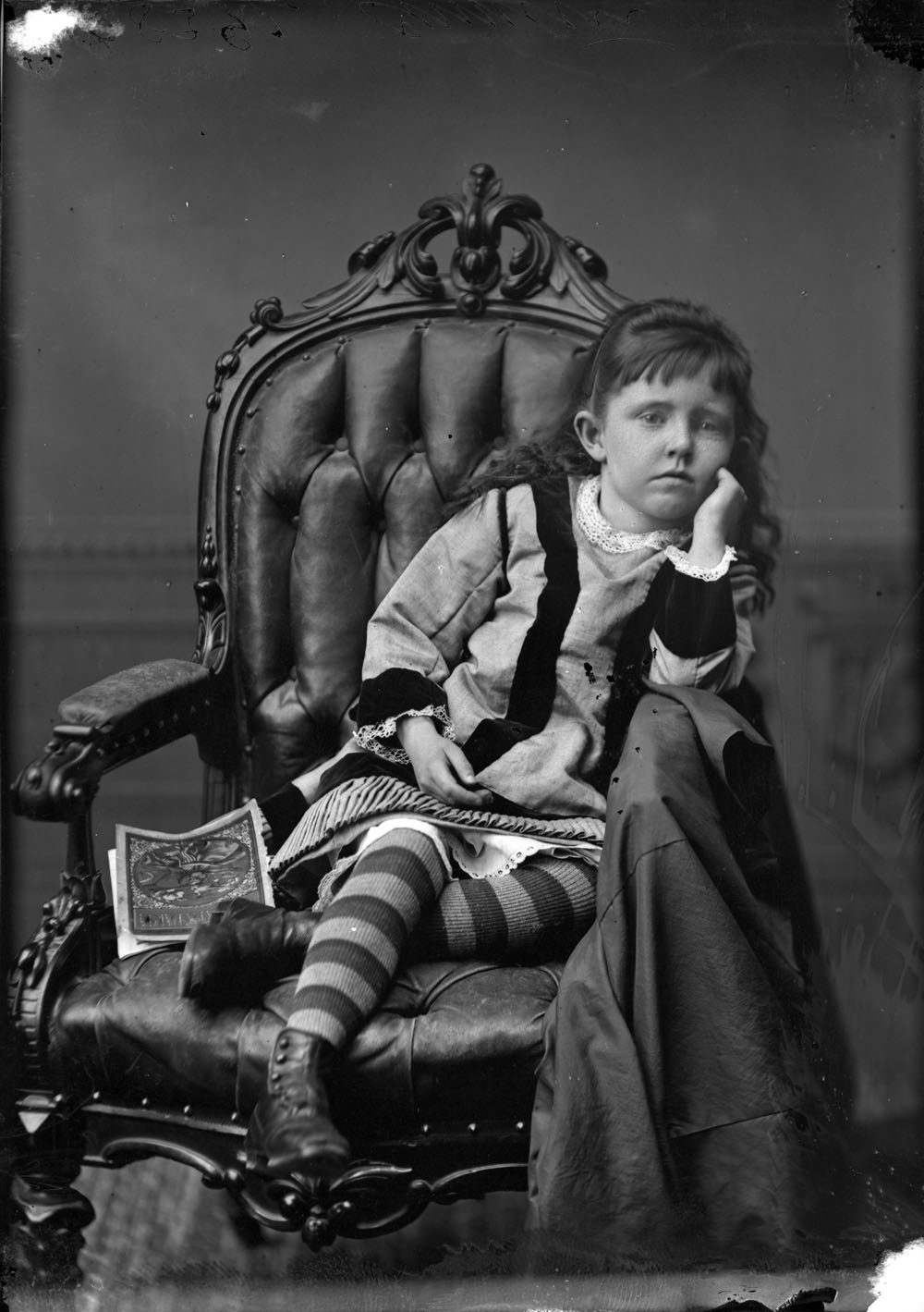 Les photographes de studio de cette époque ajoutaient souvent des accessoires dans les photos, et M. Topley n’était pas différent des autres. Dans ses portraits d’enfants, on voit des articles tels que des livres, des cordes à sauter, des poupées ou des animaux de compagnie dans les mains de ses jeunes modèles. Certains enfants sont debout ou assis bien droit avec une expression sérieuse et concentrée sur le visage, tandis que d’autres sont affalés sur une chaise. Dans ces derniers clichés en particulier, on peut imaginer à quel point le processus devait être fastidieux pour l’enfant, étant donné le nombre de plaques que le photographe devait prendre pour obtenir une image correcte et non floue.