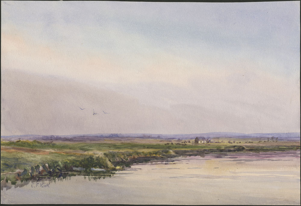 Reproduction en couleur d’une aquarelle illustrant un paysage dominé par un ciel légèrement enfumé. Une bande de terre verte sépare le ciel de la rivière.