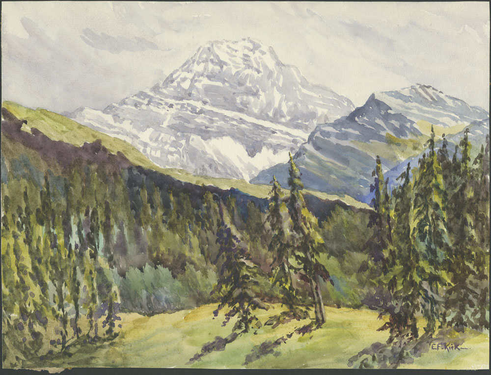 L’aquarelle est une technique de choix pour le travail à l’extérieur, car il est facile de se procurer le matériel nécessaire et de le transporter. En tant que membre du club Alpin du Canada (auquel elle se joint à l’âge vénérable de 60 ans), Mme Kirk fait de la randonnée en forêt et dans des parcs nationaux et en profite pour peindre. Son tableau du célèbre mont Edith Cavell, à Jasper Park (Alberta), illustre bien l’immensité du parc. Les montagnes dépassent de part et d’autre du tableau et donnent l’impression de s’étendre à l’infini. La densité de la forêt est représentée par le bleu, le mauve et le vert.