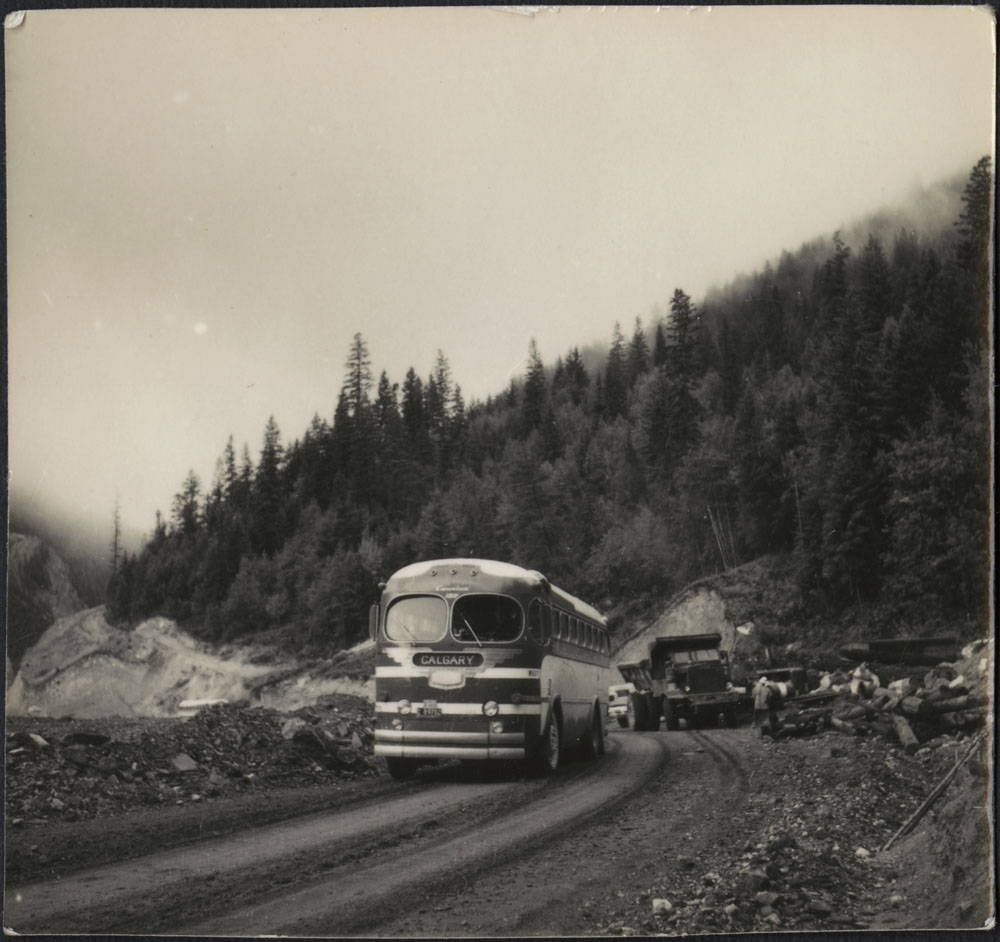 Jour 18 – 17 août. L’autobus de Calgary fait son passage quotidien dans la zone de dynamitage du canyon Kicking Horse, en Colombie Britannique. Le tronçon est seulement ouvert à la circulation entre 17 h et 8 h. (MIKAN 4359684)