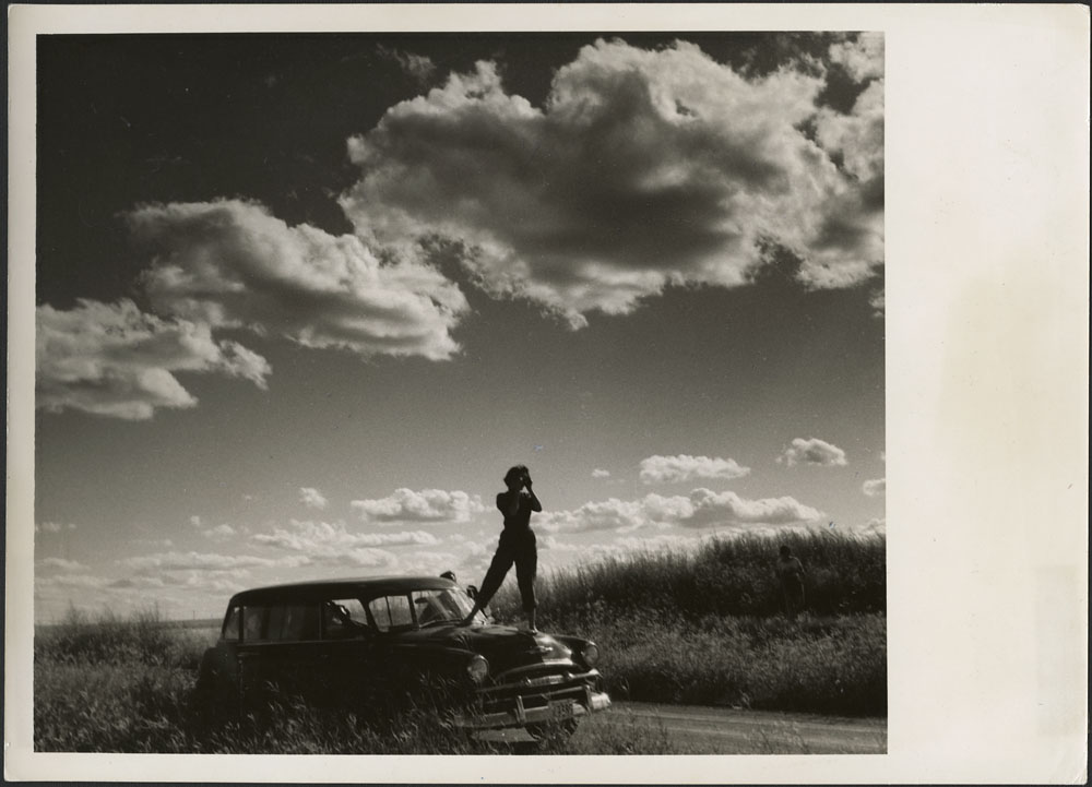 Jour 9 – 8 août. Audrey James, debout sur le capot de la familiale d’Helen Salkeld, photographie la prairie dans le sud de la Saskatchewan. (MIKAN 4814412)