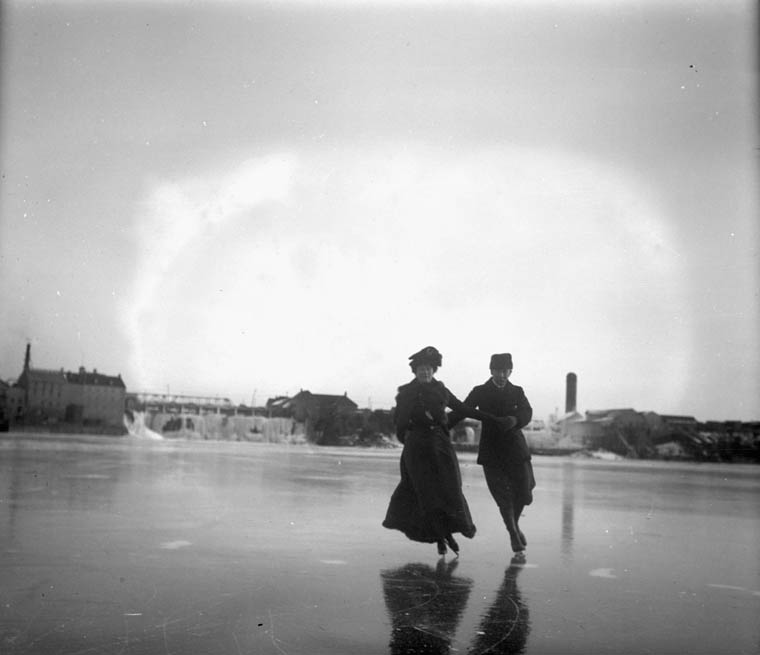 Le gouverneur général, Lord Minto, et Lady Minto patinant sur la rivière des Outaouais. Lord Minto a fait don de la Coupe Minto en 1901. La photographie a été prise par William James Topley. (MIKAN 3436516)