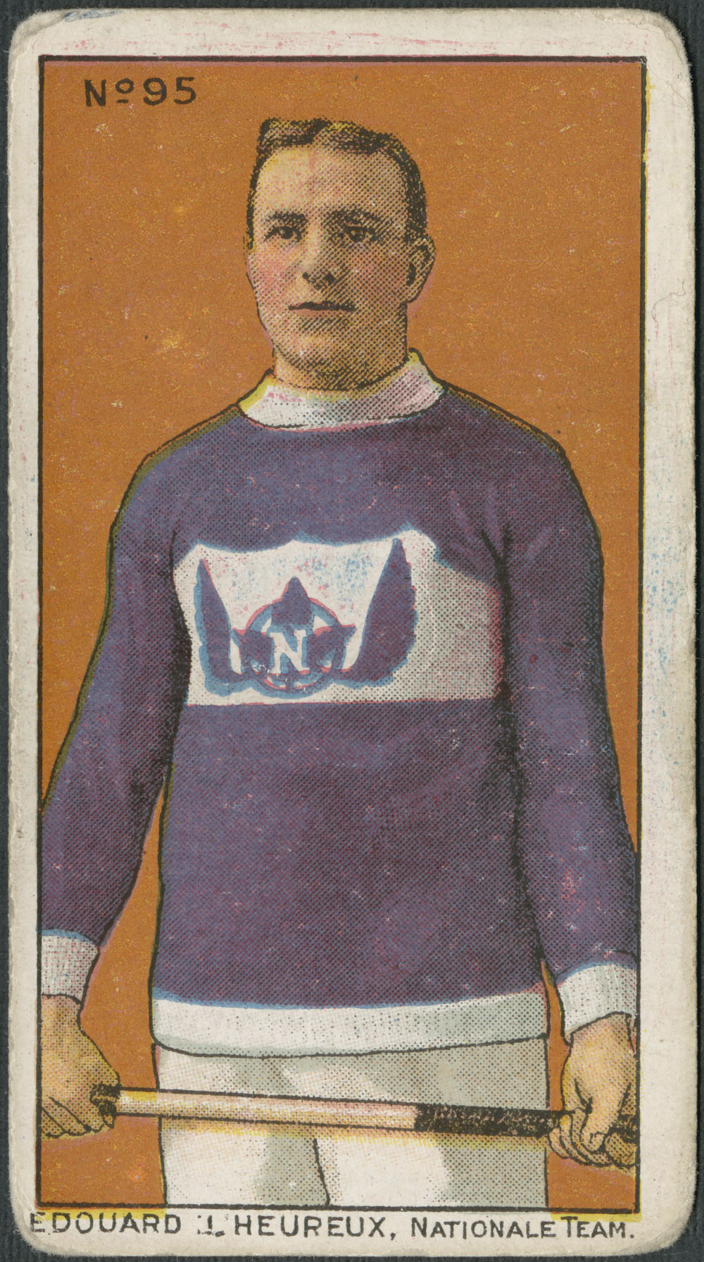 Edouard L’Heureux, gardien de but de l’équipe Nationale (Nationals de Montréal). Son équipe a perdu contre les Salmonbellies durant la série challenge pour la Coupe Minto, en septembre 1910. Avant la Première Guerre mondiale, la crosse professionnelle était un sport populaire au Canada. Les cartes à collectionner illustrées ici étaient vendues au Canada par Imperial Tobacco dans les paquets de cigarettes, vers 1910-1911. (MIKAN 2962986)