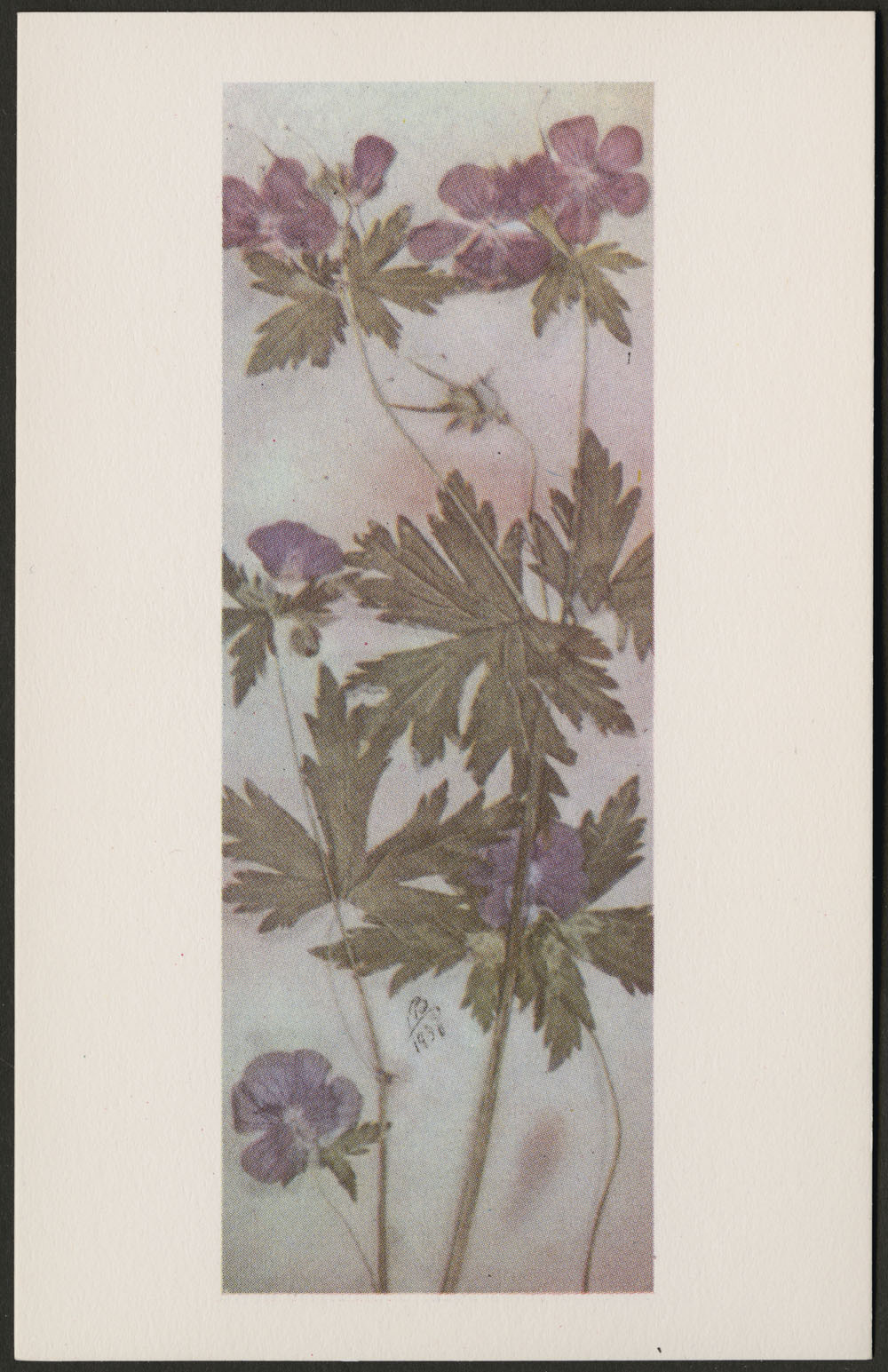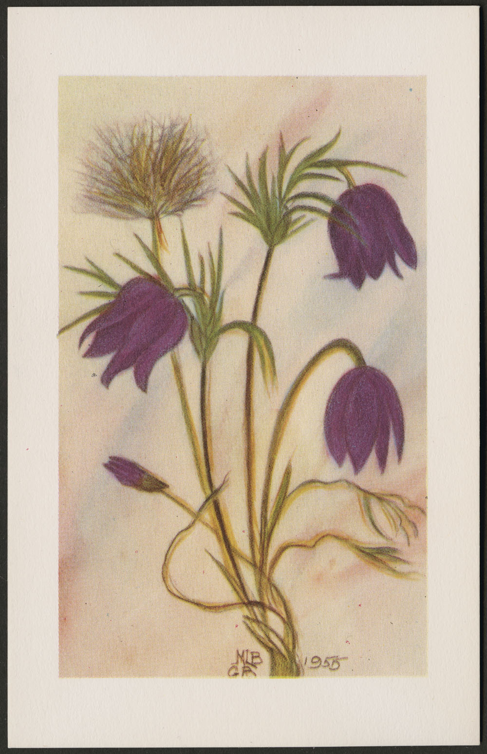 Reproduction en couleur d’une plante avec quatre fleurs pourpres et une fleur montée en graines. Dans le bas, au centre, se trouvent les initiales « MLB » et « GB ». L’œuvre est datée de 1955.
