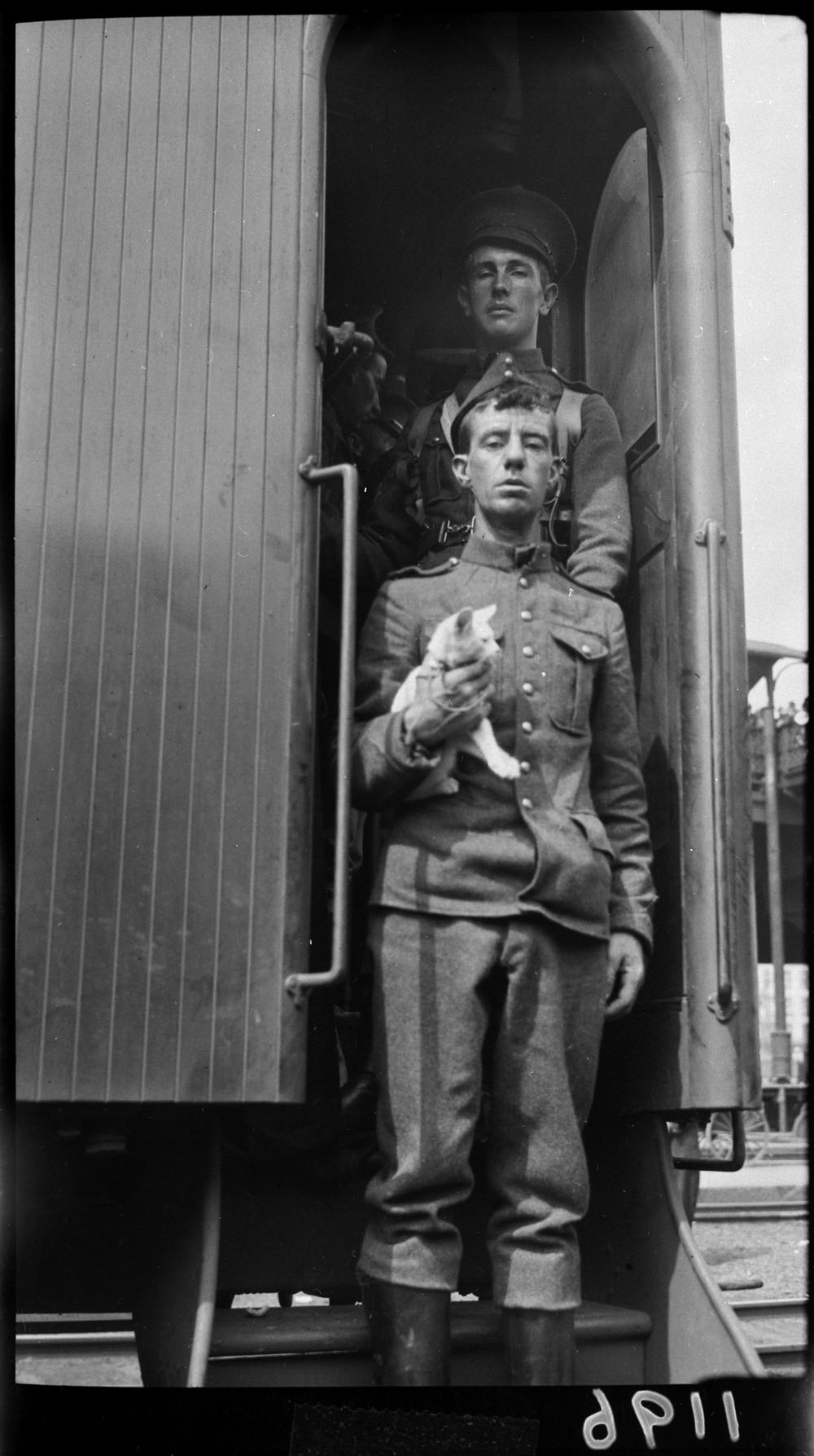 Des soldats volontaires et le chat qui sert de mascotte au 28e Régiment à Toronto, en Ontario, le 22 août 1914. (MIKAN 3403478)