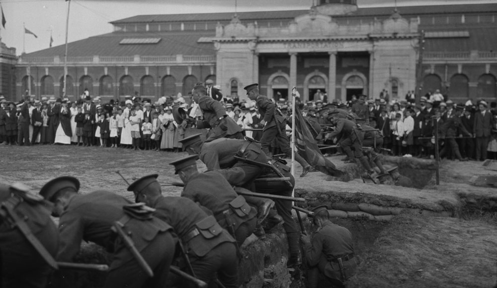 Des soldats sortent de la tranchée sur le terrain de l’exposition à Toronto, en Ontario, le 11 septembre 1915. (MIKAN 3403554)