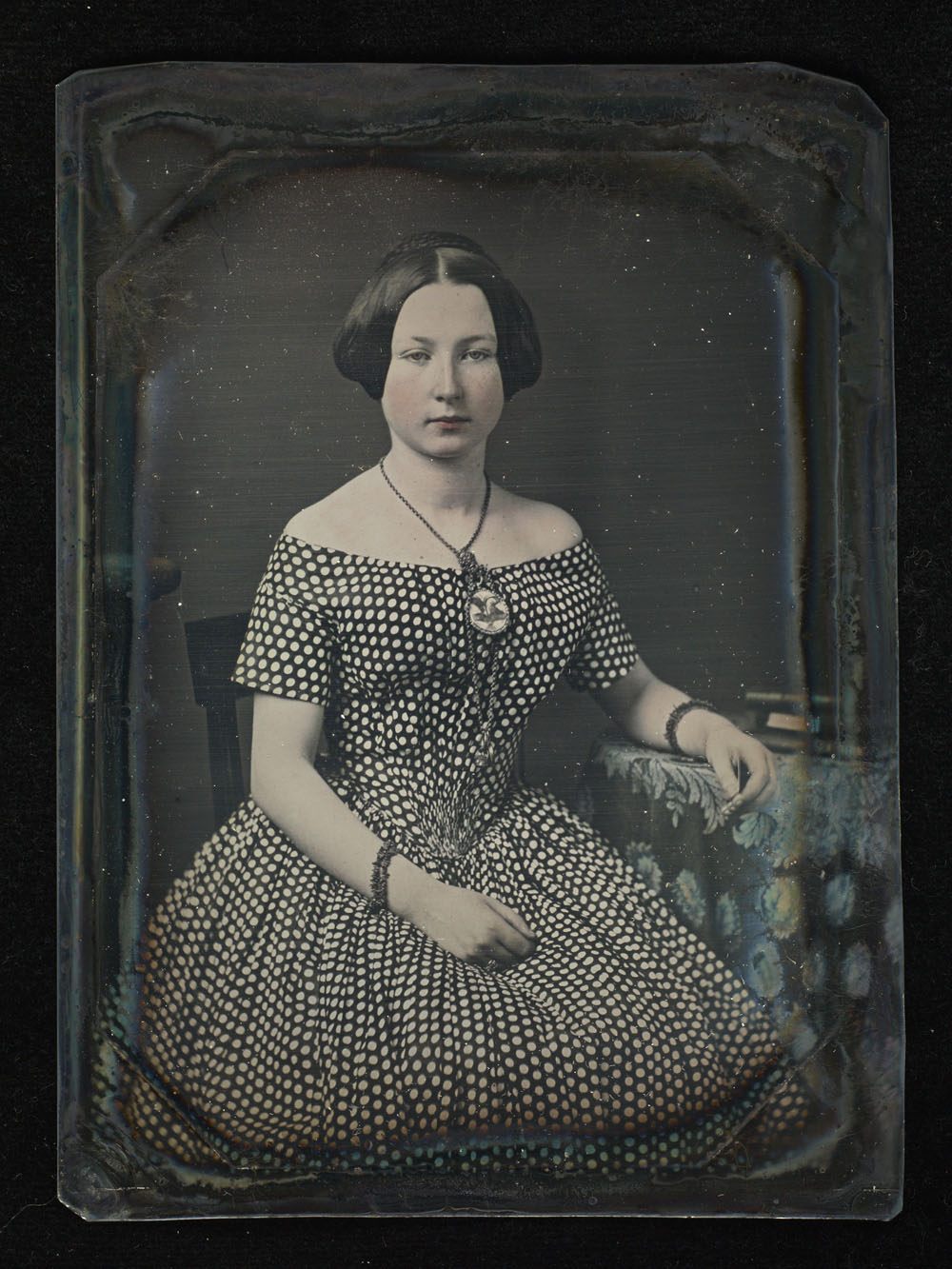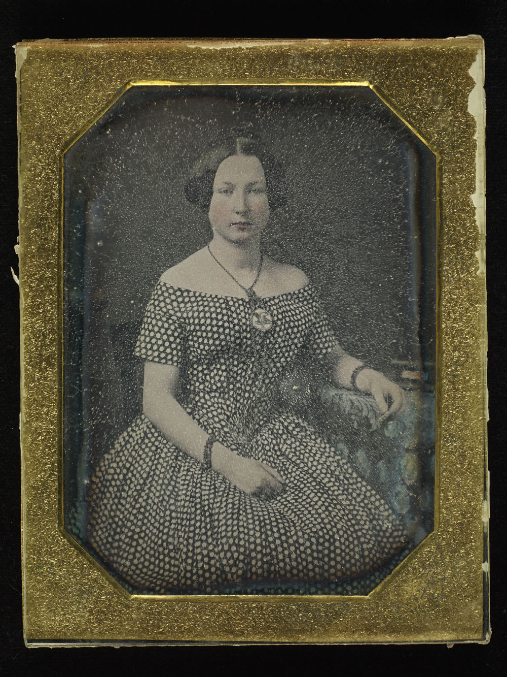 Kate McDougall, vers 1848. Daguerréotype dont le verre est à un stade avancé de détérioration. On voit le phénomène de transpiration du verre; l’image est floue. (MIKAN 3192966)