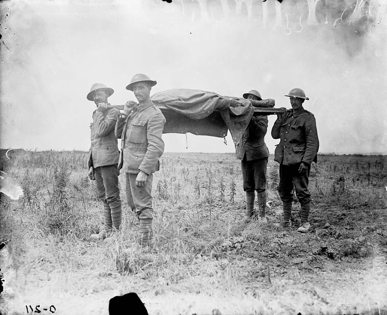 Transport d’un corps dans un champ de bataille de la Somme, juillet 1916, Bureau canadien des archives de guerre (MIKAN 3520928)