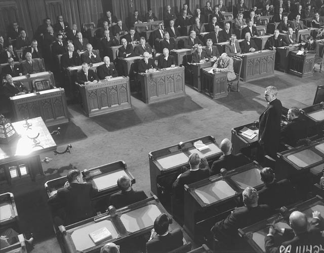 Le premier ministre John Diefenbaker s’adresse à la Chambre des communes, le 14 octobre 1957. (MIKAN 3214921)