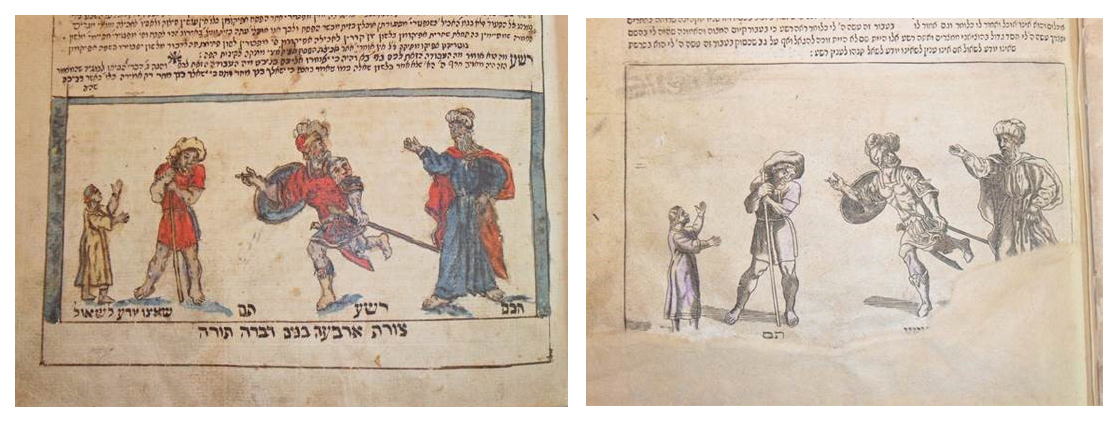 À gauche, illustration en couleur des quatre fils dans la Haggadah d’Altona (AMICUS 33226322); à droite, version gravée des quatre fils dans la Haggadah d’Amsterdam (AMICUS 29060785).