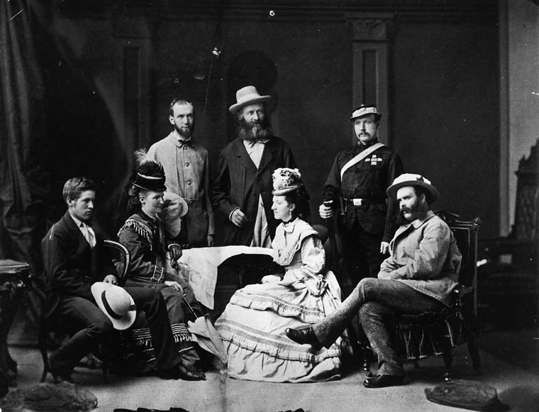 Membres de l’expédition de sir Sandford Fleming qui traversa le Canada d’un océan à l’autre en 1872. Assis, de gauche à droite : Frank Fleming, Mme Fleming, Mme Moren et le docteur Arthur Moren. Debout, de gauche à droite : le révérend G. M. Grant, sir Sandford Fleming et le colonel Robertson Ross (MIKAN 3629938)