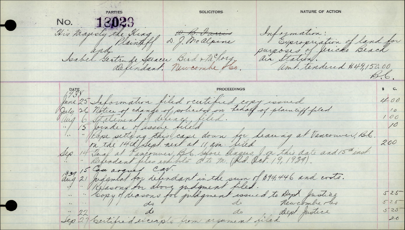 Le 25 juin 1938, le gouvernement (représenté par le Roi) dépose une déclaration. Ce premier document a pour but de signifier l’expropriation d’une propriété appartenant à Isabel Gertrude Spencer, à qui on offre une compensation financière. La raison de l’expropriation : l’Aviation royale du Canada veut construire sur ce terrain un mess des officiers pour la station aérienne de Jericho Beach, à Vancouver.