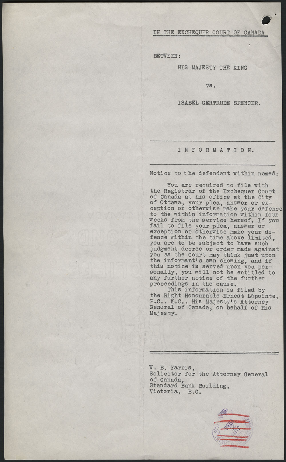 L’honorable Ernest Lapointe, procureur général du Canada, au nom du Roi, dépose une requête concernant l’expropriation de la propriété d’Isabel Gertrude Spencer (MIKAN 4936613)