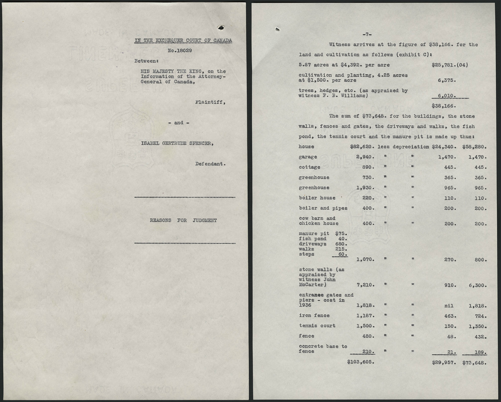 Cette cause opposait le plaignant – le Gouvernement du Canada, représenté par le Roi – à la défenderesse Isabel Gertrude Spencer, épouse du colonel Victor Spencer. Les documents les plus intéressants pour la comprendre sont la déclaration sur l’expropriation, la déclaration de la défense, le jugement et les raisons du jugement.