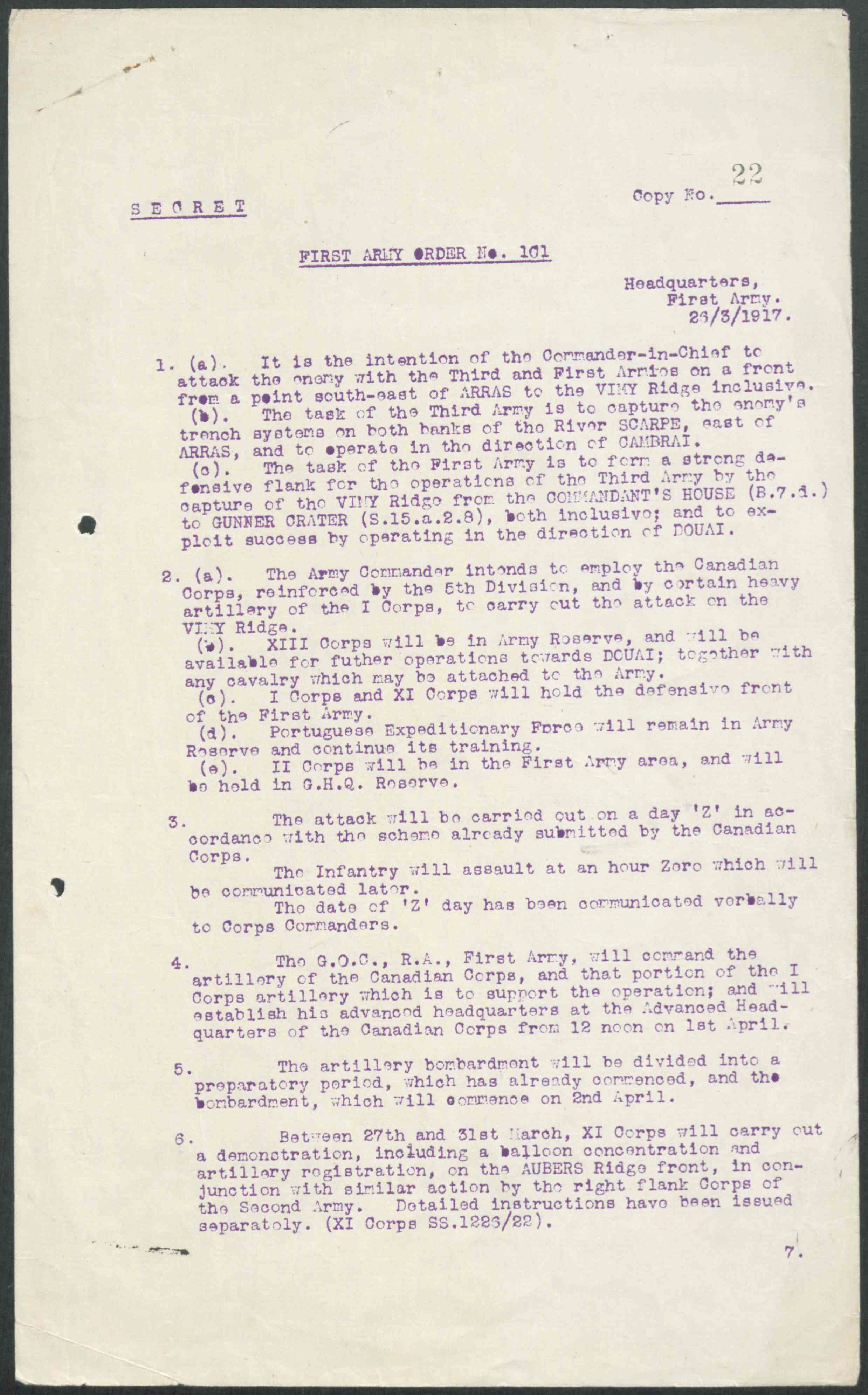 Deux pages de commandes dactylographiées et miméographiées décrivant la cible, les armées utilisées, la date et l’heure de l’attaque (« Jour Z »), l’utilisation de l’artillerie, l’utilisation de tactiques trompeuses pour masquer l’ampleur de la force de frappe, les plans d’urgence concernant le retrait des troupes allemandes avant le jour Z et l’emplacement du principal quartier général avancé de l’armée en date du 4 avril.