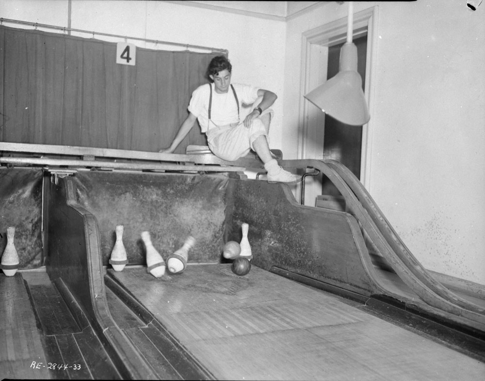 Une photo noir et blanc d’un planteur de quilles assis au-dessus d’une partie de cinq quilles au moment où une boule atteint les quilles.