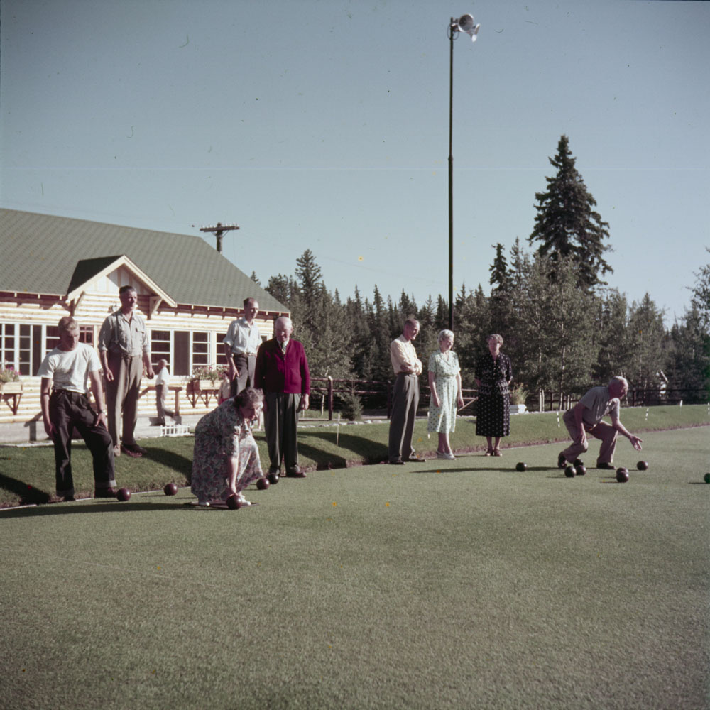 Neuf personnes jouant au boulingrin au parc national du Mont-Riding (Manitoba) ( MIKAN 4317515)