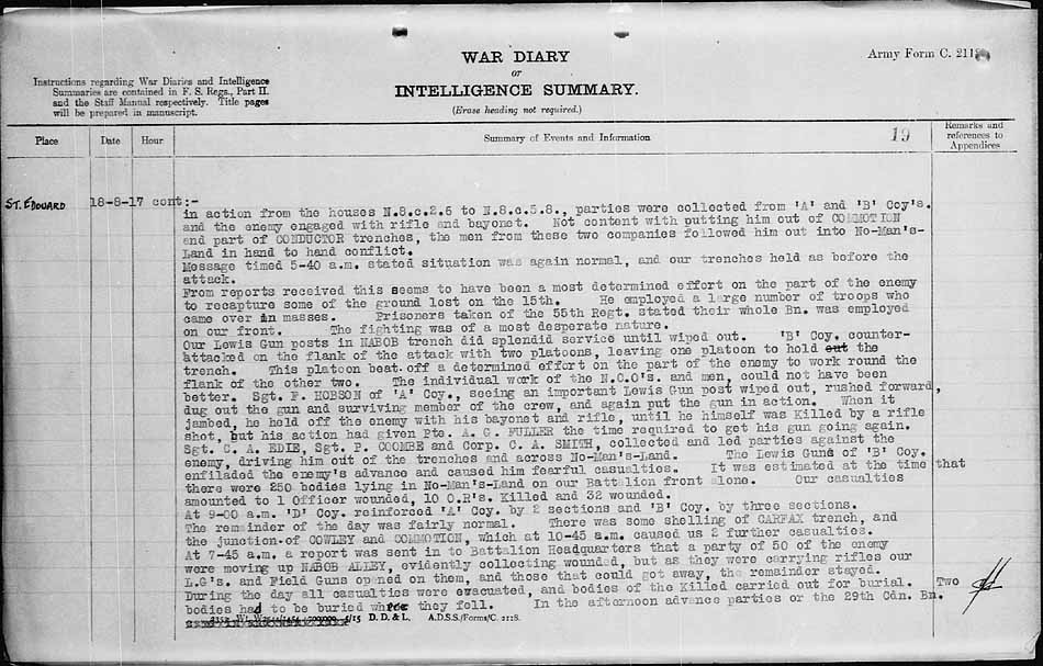 Journal de guerre du 20e bataillon d’infanterie du Canada, daté du 18 août 1917, page 20 (MIKAN 205918)