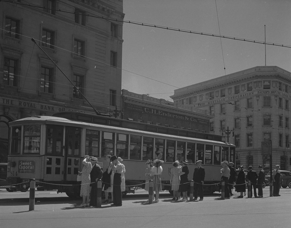 Un groupe de personnes attend de monter dans le tramway, Winnipeg (Manitoba) (MIKAN 4328867)