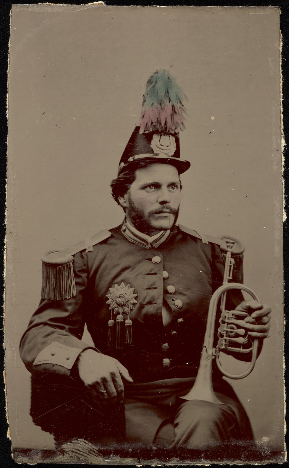 Joueur de bugle (clairon) avec son instrument, portant l’uniforme de l’harmonie locale. (MIKAN 3511014)