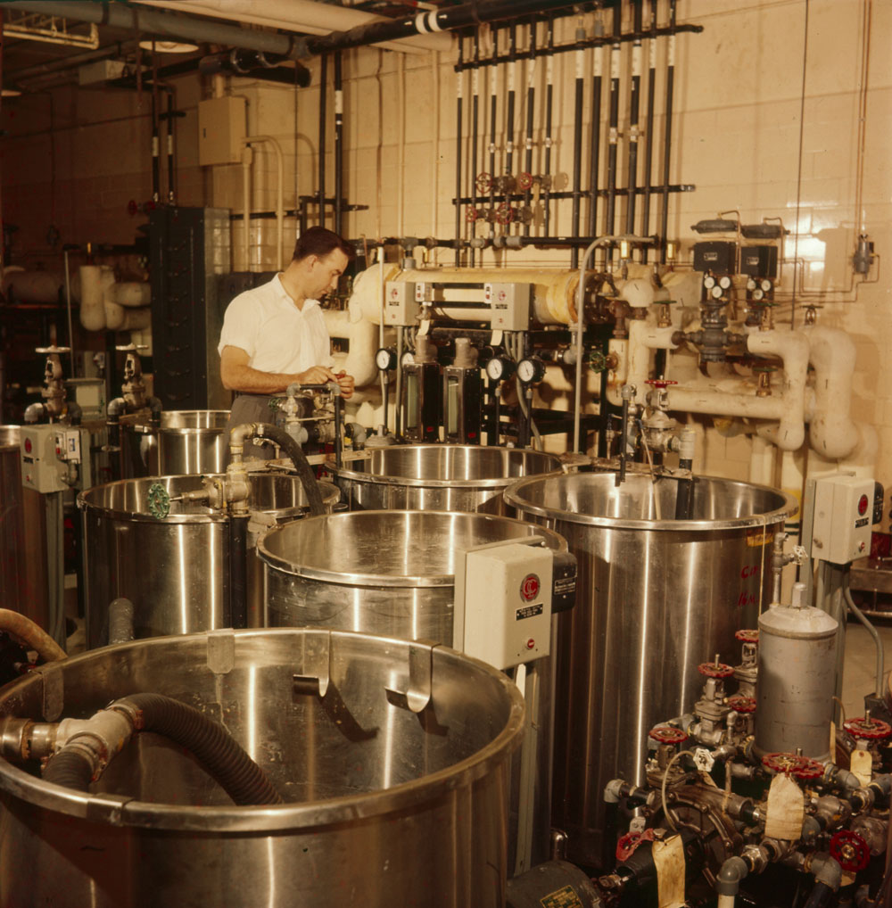 Bert Hooper, chef du laboratoire de produits chimiques, supervise la préparation des différents liquides utilisés pour le développement des films à l’édifice de l’Office national du film du Canada, à Ville St-Laurent, Montréal (Québec) [MIKAN 4313950]
