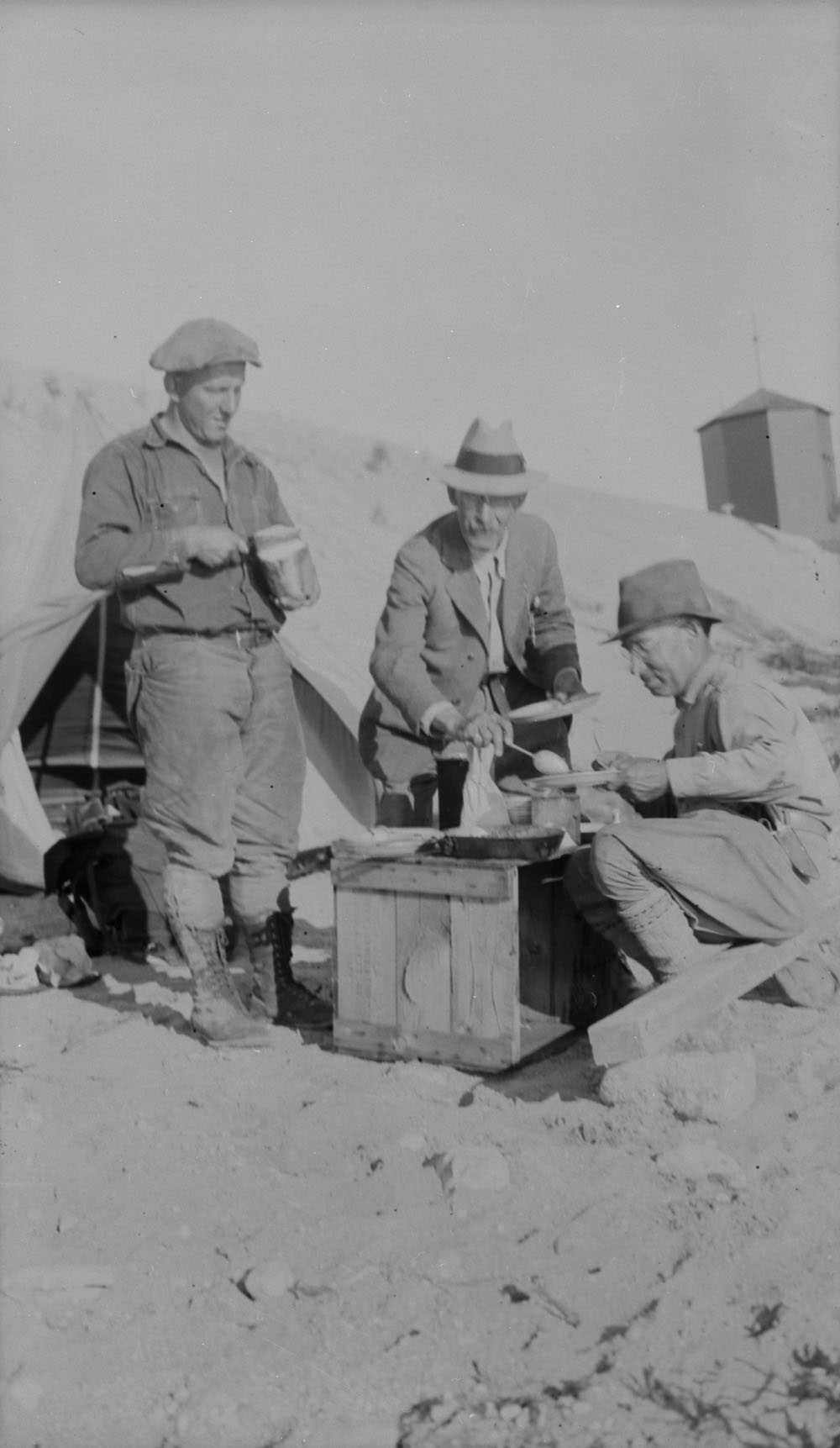 L. Belanger, A. A. Cole et L. H. Cole prenant leur déjeuner à Moose River Crossing (Ontario) [MIKAN 3372757]