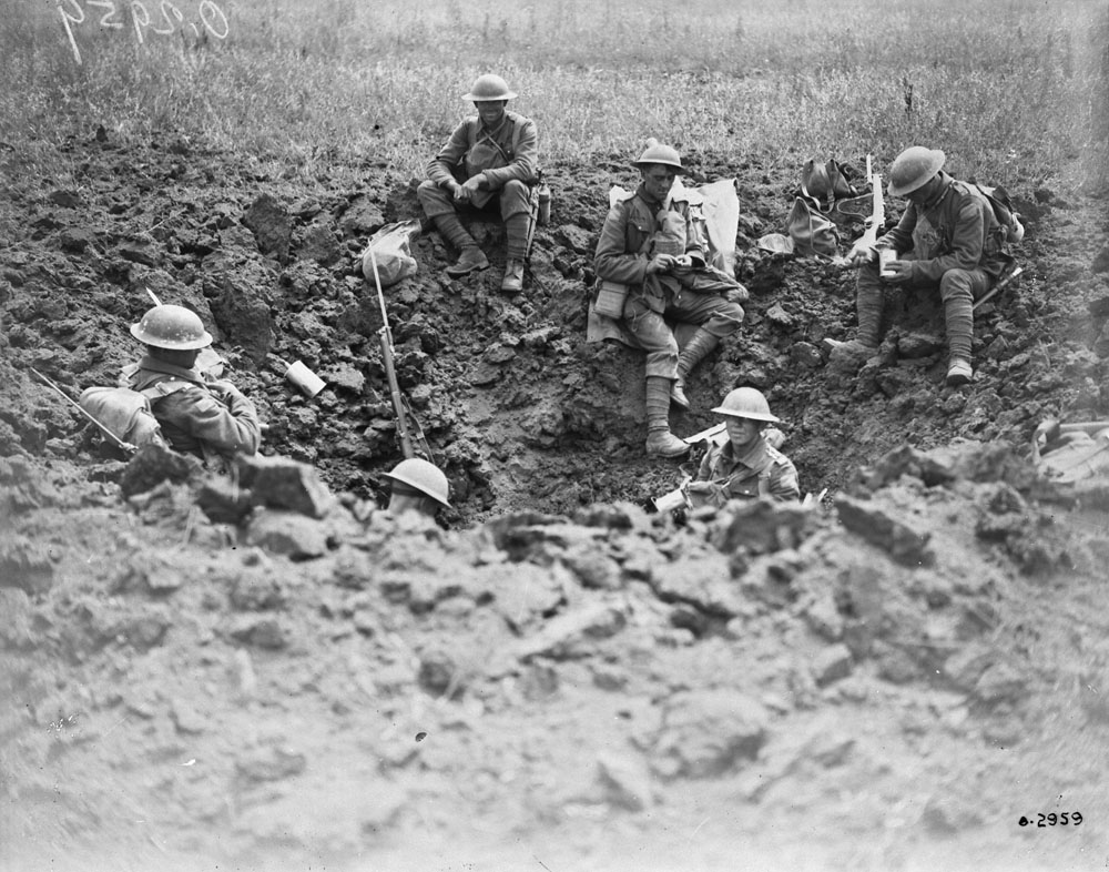 Des Canadiens se reposant dans un trou d’obus créé par leur propre artillerie, août 1918 (a002859).