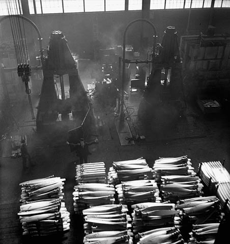 Vue, depuis un pont roulant, d’une forge d’aluminium produisant des hélices de bombardier dans une usine de l’Aluminum Company of Canada, Kingston (Ontario) [MIKAN 3628256]