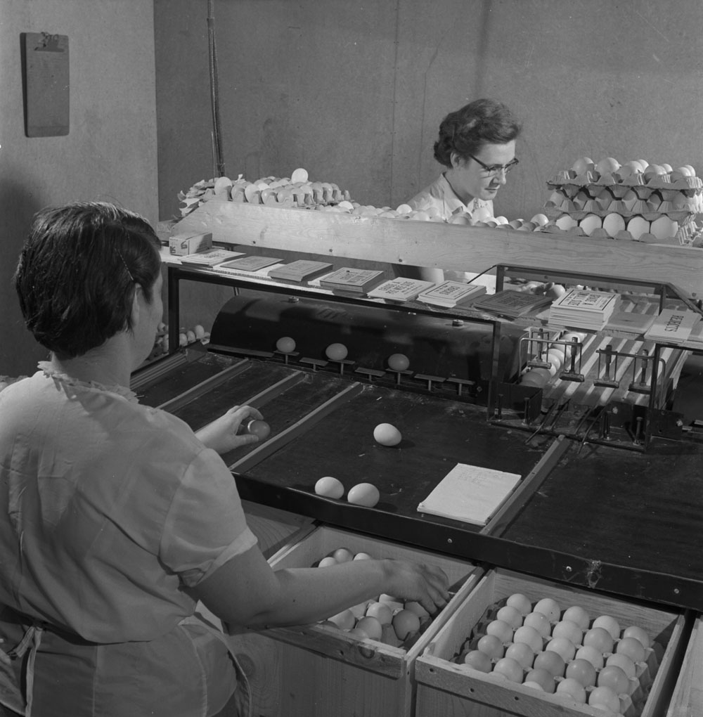 Photo noir et blanc de deux femmes inspectant des œufs qui défilent sur un transporteur à courroie et les plaçant dans des boîtes.