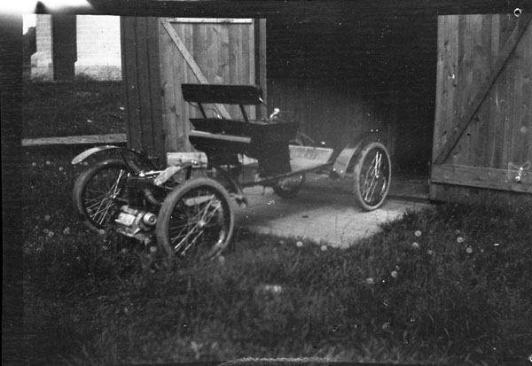 Photo noir et blanc d’une ancienne automobile garée à l’extérieur d’une grange.
