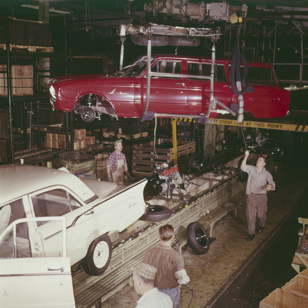 Une automobile est abaissée sur une ligne de production, Ford du Canada Limitée [e010975565]