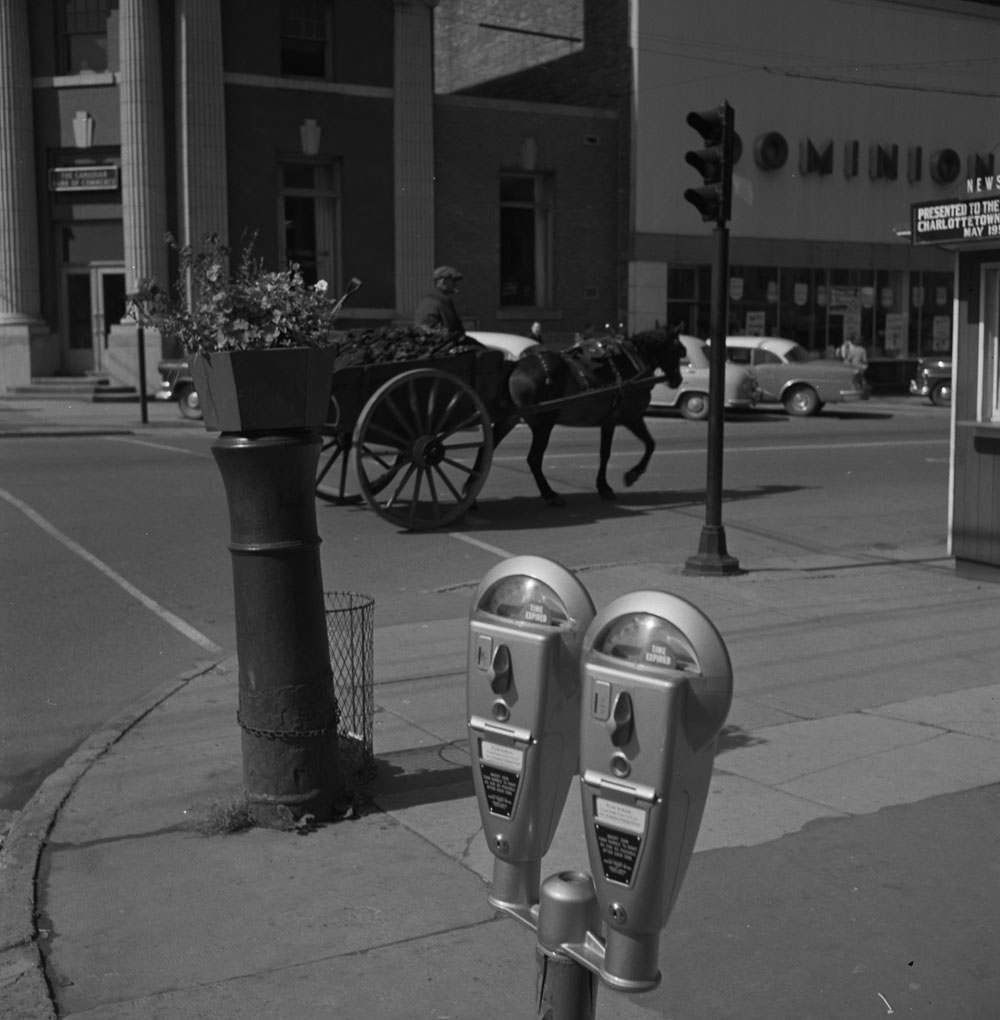 Charrette tirée par un cheval passant près d’un double parcomètre, Charlottetown (Île-du-Prince-Édouard) [e011176837]