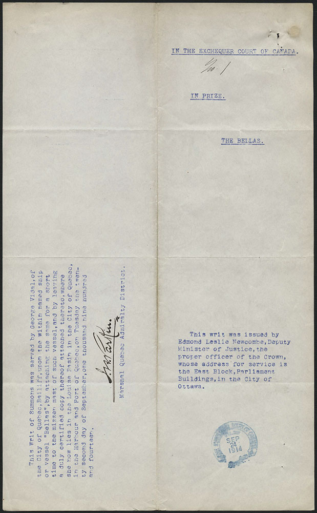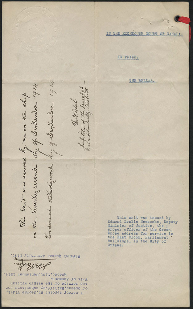 Le 16 septembre, le sous-ministre de la Justice émet un bref de saisie par la Cour de l’échiquier qui est présenté aux autorités du Bellas à Québec, le 22 septembre. Ce bref amorce la cause no 1 au tribunal des prises sous la responsabilité de la Cour de l’échiquier. Le bref est publié dans le Montreal Gazette et dans le Quebec Chronicle par le registraire de la Cour. Le bateau reste détenu par le shérif jusqu’à nouvel ordre de la Cour. Un second ordre de la Cour, signé le 15 décembre 1914 par le juge Cassels, en prolonge la détention.