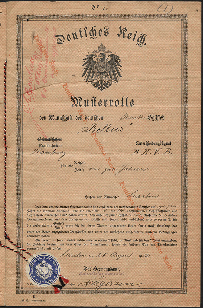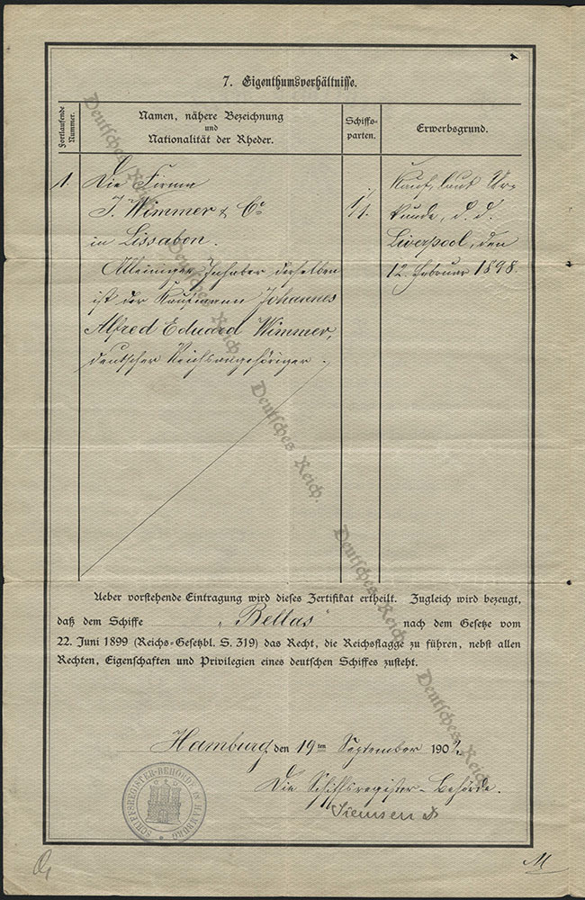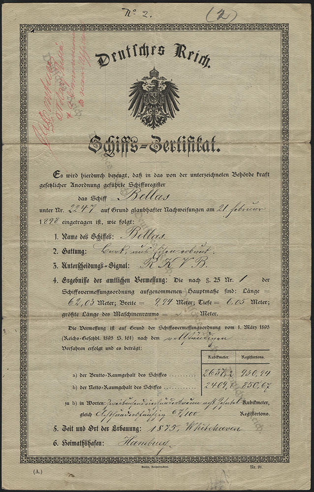 Le certificat d’enregistrement du Bellas indique que son port d’attache est Hambourg, en Allemagne, et que le propriétaire est l’armateur allemand Johannes Alfred Eduard Wimmer (e011312630)