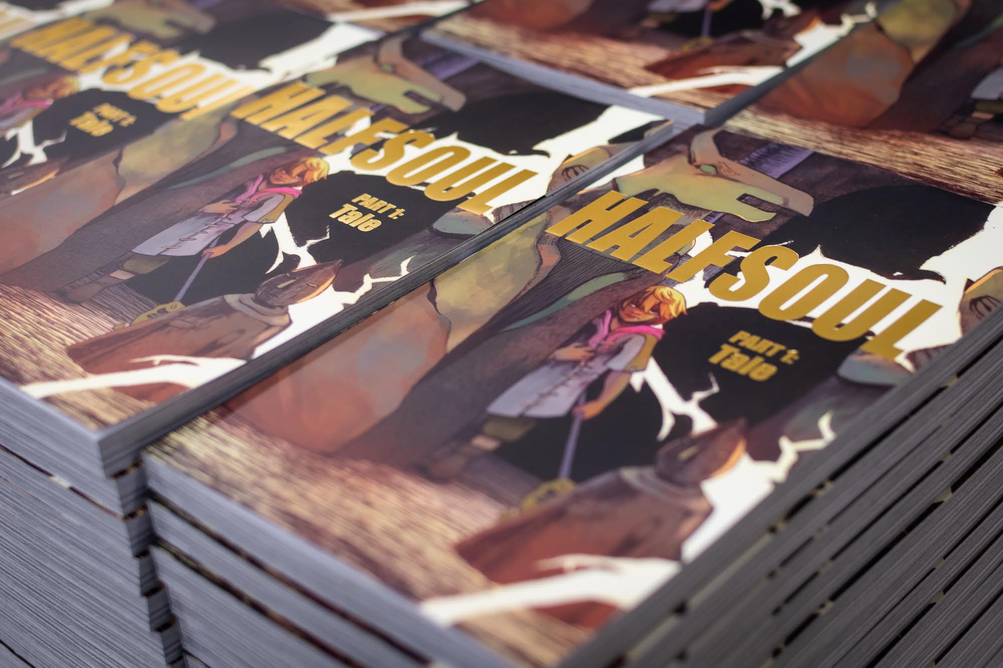 C’est aussi sur Tapas que Kelly a publié sa bande dessinée Halfsoul. Pendant plus d’un an et demi, elle en a étoffé le contenu, pour finalement décider d’en faire un roman graphique, à paraître en quatre tomes. En mai 2018, elle a lancé un projet sur Kickstarter pour financer la publication du premier volume.