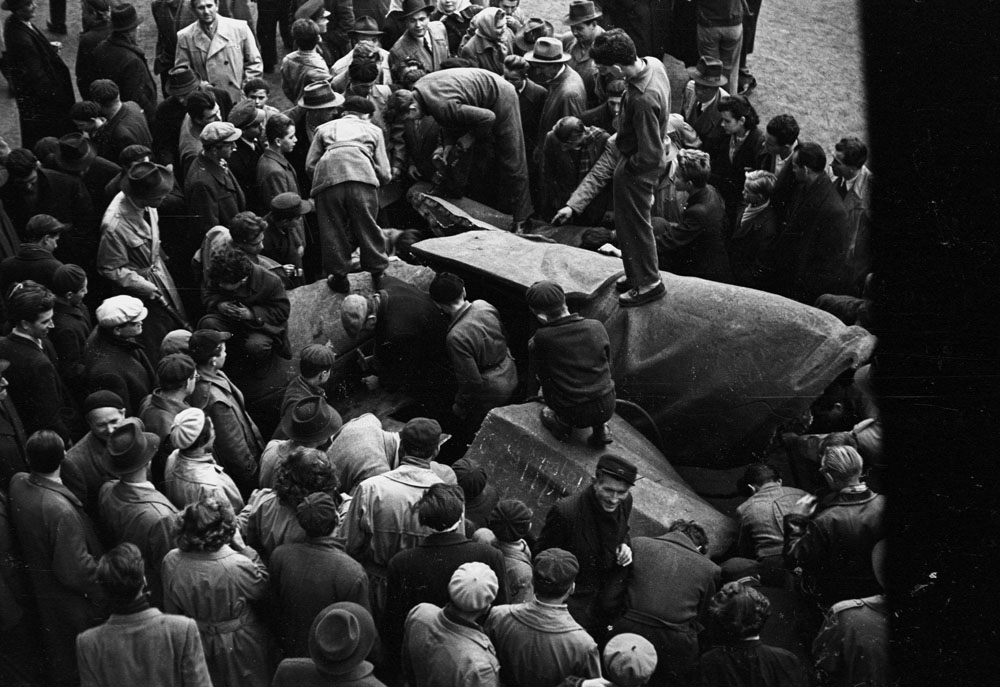 Foule prenant d’assaut un monument en hommage à Staline, Budapest, 1956. Photo : Gabor Szilasi (e011313448)