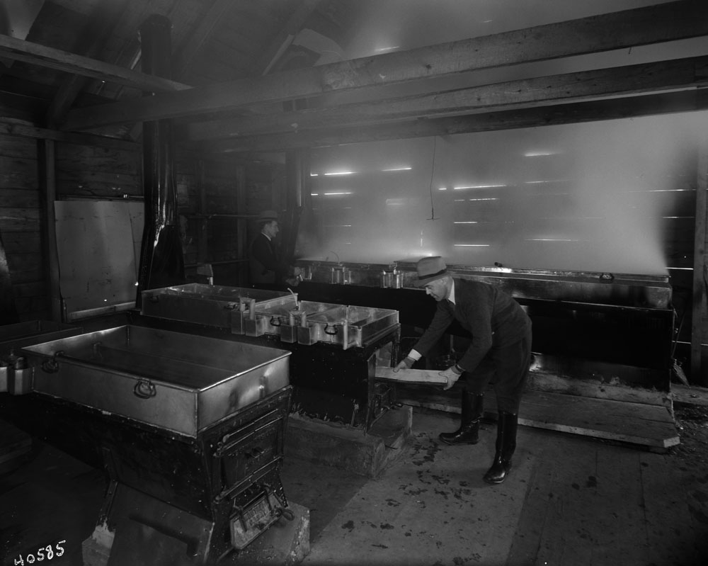 Photo noir et blanc de deux hommes à l’intérieur d’une cabane en bois rond, faisant bouillir de l’eau d’érable dans des cuves métalliques en forme d’auge.