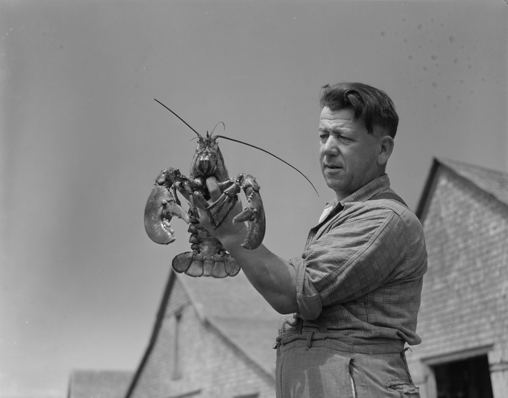 Photo noir et blanc d’un homme tenant un gros homard dans sa main gauche.
