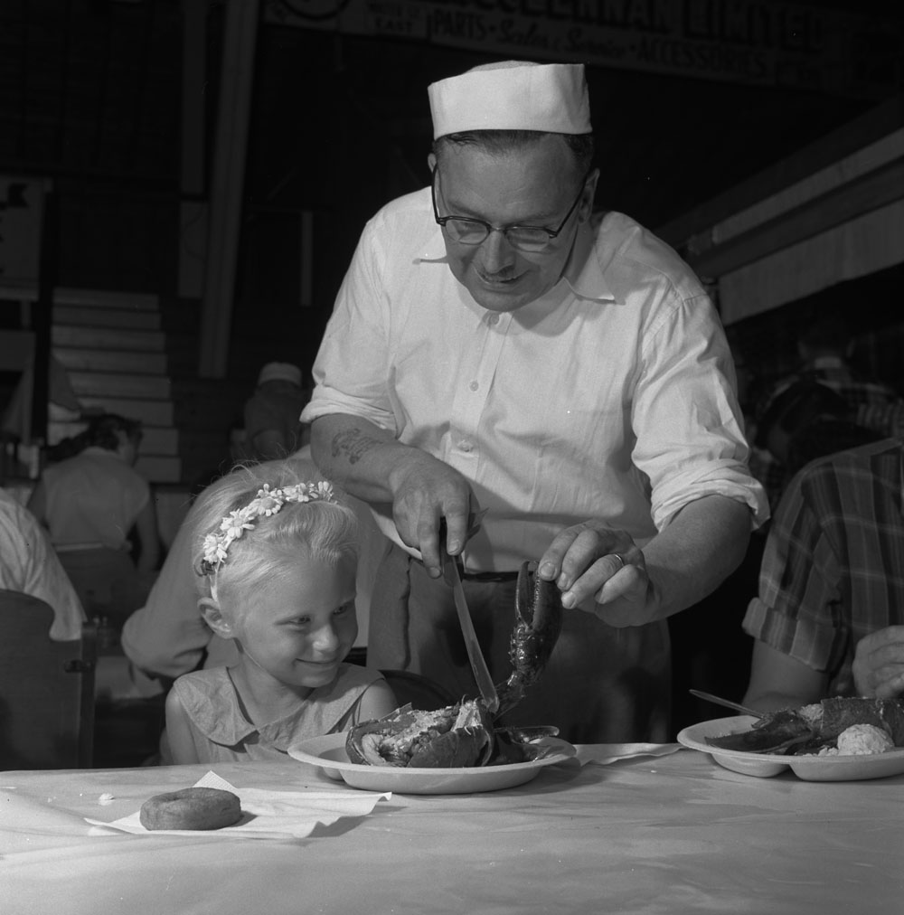 Photo noir et blanc d’un homme aidant une fillette attablée devant son repas de homard.
