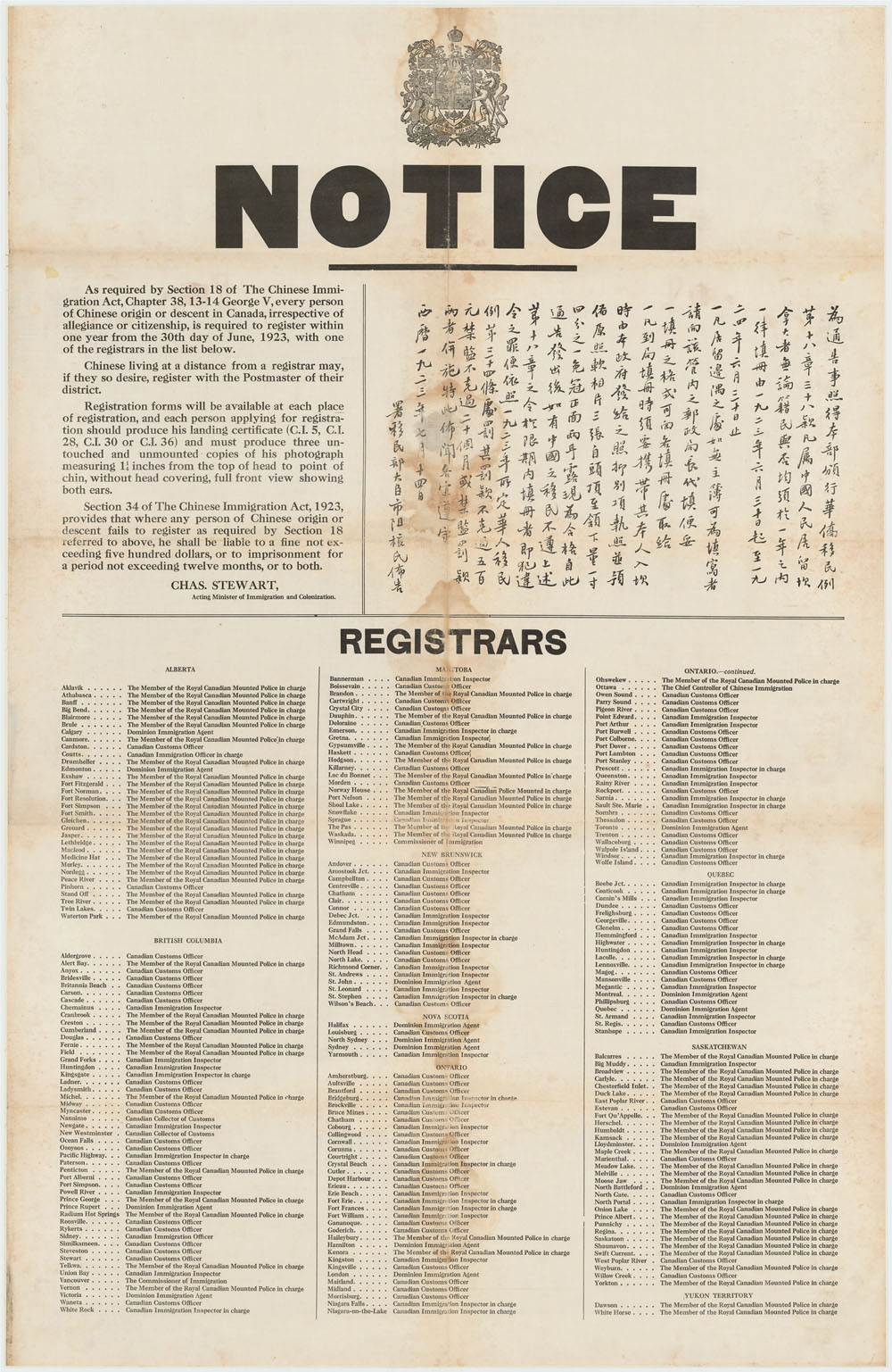 L’article 18 de la Loi d’exclusion des Chinois a été traduit en chinois puis affiché en tant qu’avis public. L’avis faisait 69 cm sur 123 cm (environ 2 pi sur 4 pi) et dressait également une liste des différents lieux d’inscription au Canada. Une amende maximale de cinq cents dollars ou une période d’emprisonnement d’un maximum de douze mois, ou même les deux, pouvaient être imposées en cas de non-respect des exigences relatives à l’inscription.