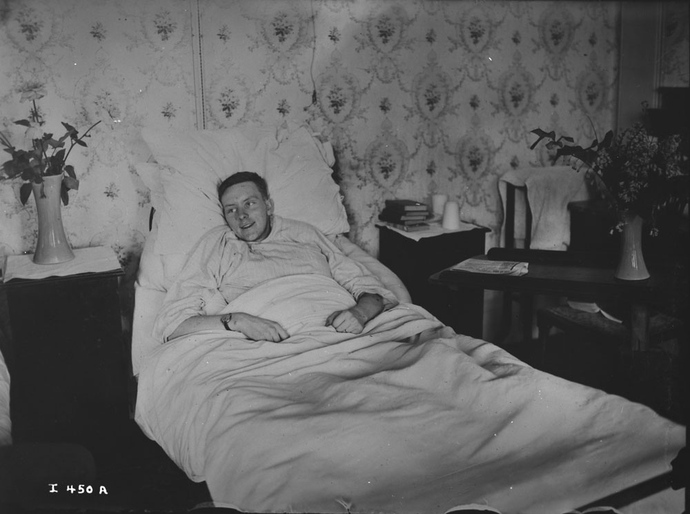 Dans l’aile féminine de l’hôpital du camp de New Denver, on voit toute la chaleur humaine que véhiculent ces sourires. [Le photographe semble avoir préparé cette scène avec la patiente internée; remarquons le ruban ornant le sommet de sa chevelure.] (e999900300-u)