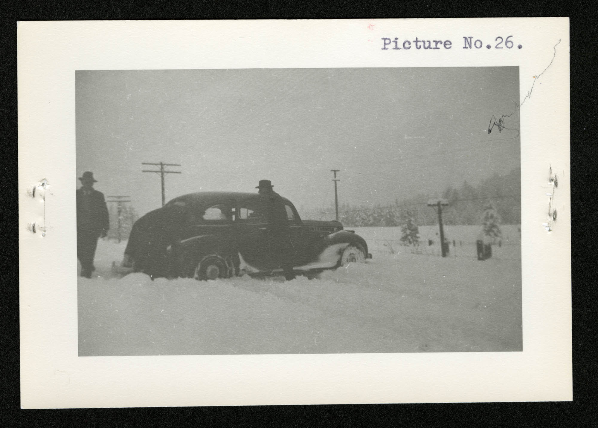 Photo no 26 [L’automobile du délégué du Comité international de la Croix-Rouge est prise dans une épaisse neige lors de sa tournée d’inspection des camps en hiver 1943]. Photo : Ernest L. Maag (e999900382-u)