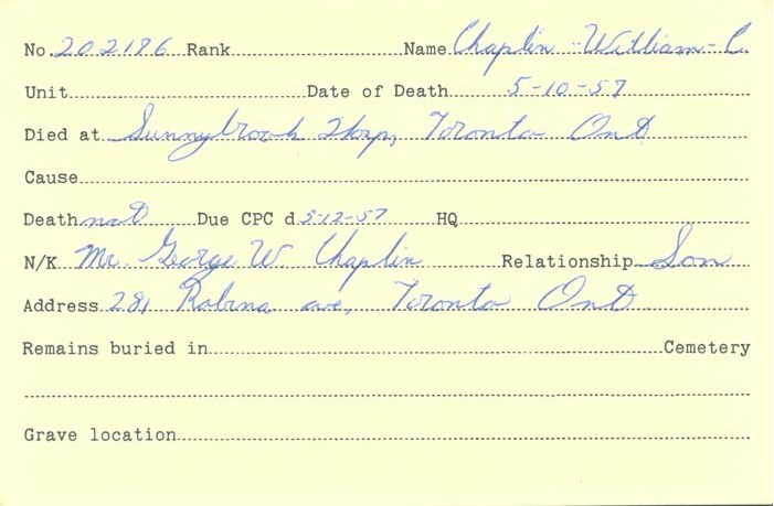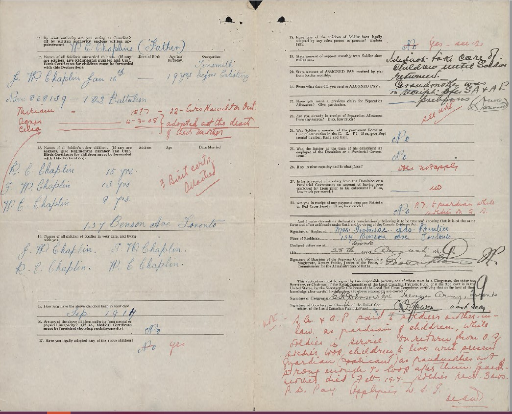 ![Document dactylographié et manuscrit intitulé Particulars of Family of an Officer or Man Enlisted in C.E.F. (Canadian Expeditionary Force) [Renseignements sur la famille d’un officier ou d’un soldat enrôlé dans le Corps expéditionnaire canadien (CEC)]. Tiré du dossier de service de William Charles Chaplin dans la base de données Dossiers du personnel de la Première Guerre mondiale.](https://ledecoublogue.com/wp-content/uploads/2021/08/pic9.jpg?w=584)