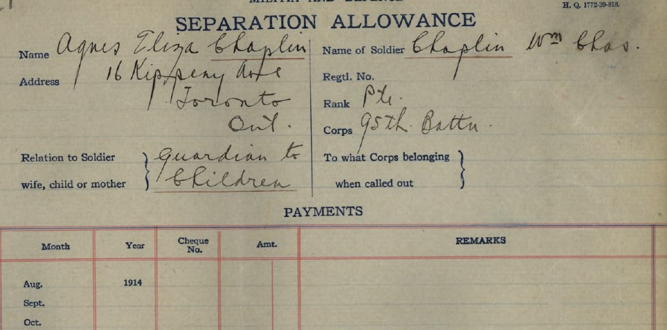 ![Document dactylographié et manuscrit ayant pour titre Canadian Expeditionary Force (Information for Separation Allowance Board) [Corps expéditionnaire canadien (CEC) : Renseignements pour le Separation Allowance Board, l’organisme responsable des allocations aux épouses de mobilisés]. Tiré du dossier de service de William Charles Chaplin dans la base de données Dossiers du personnel de la Première Guerre mondiale.](https://ledecoublogue.com/wp-content/uploads/2021/08/pic10.jpg?w=584)