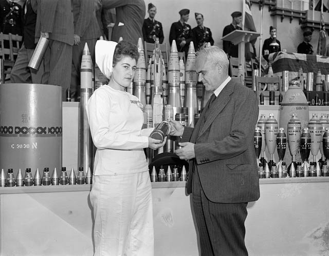 Edna Poirier, une employée de la Defence Industries Limited (DIL), présente à l’honorable C. D. Howe le 100 000 000e projectile fabriqué à l’usine Cherrier, Saint-Paul-l’Hermite (Québec), septembre 1944. (e000762462)