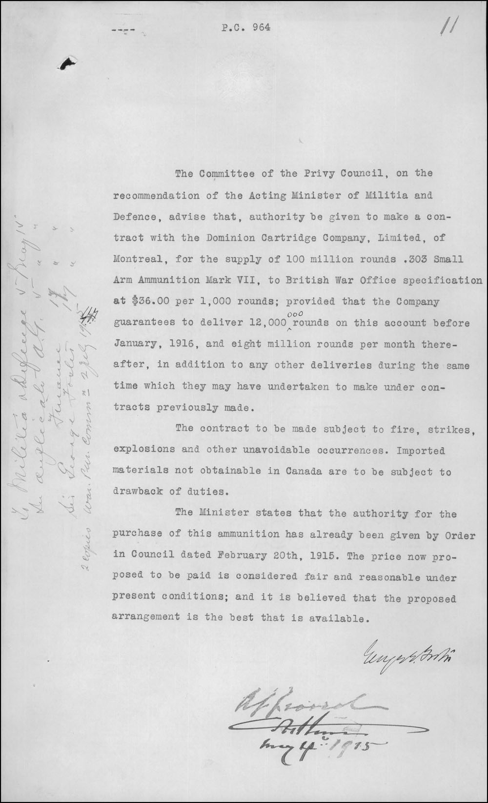 Décret du Bureau du Conseil privé approuvant l’établissement d’un contrat avec la Dominion Cartridge Company pour la production de munitions, mai 1915. (e010916133)